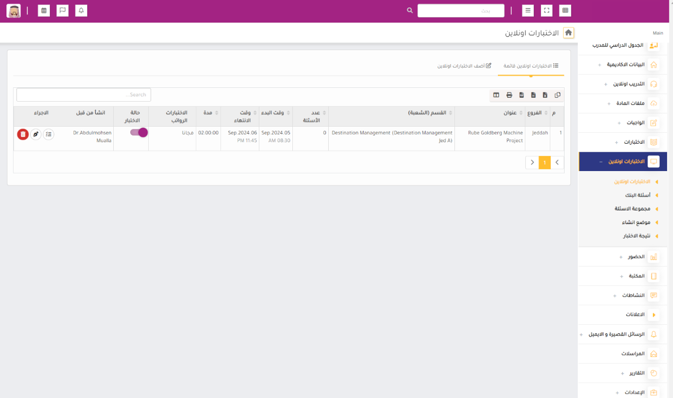 يتيح للمعلمين إنشاء اختبارات بأنواع متعددة من الأسئلة، تحديد درجات كل سؤال، وجدولة الاختبارات حسب المادة والشعبة وتسجيل النتائج في السجل الأكاديمي، مع إمكانية إصدار تقارير تفصيلية عن أداء الطلاب.