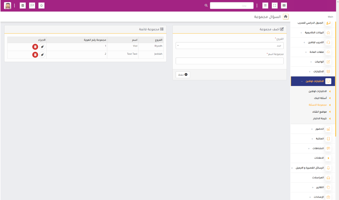 لاضافة مجموعة الاسئلة قم باختيار الفرع ثم قم بتسمية المجموعة الجديدة ثم قم بالحفظ