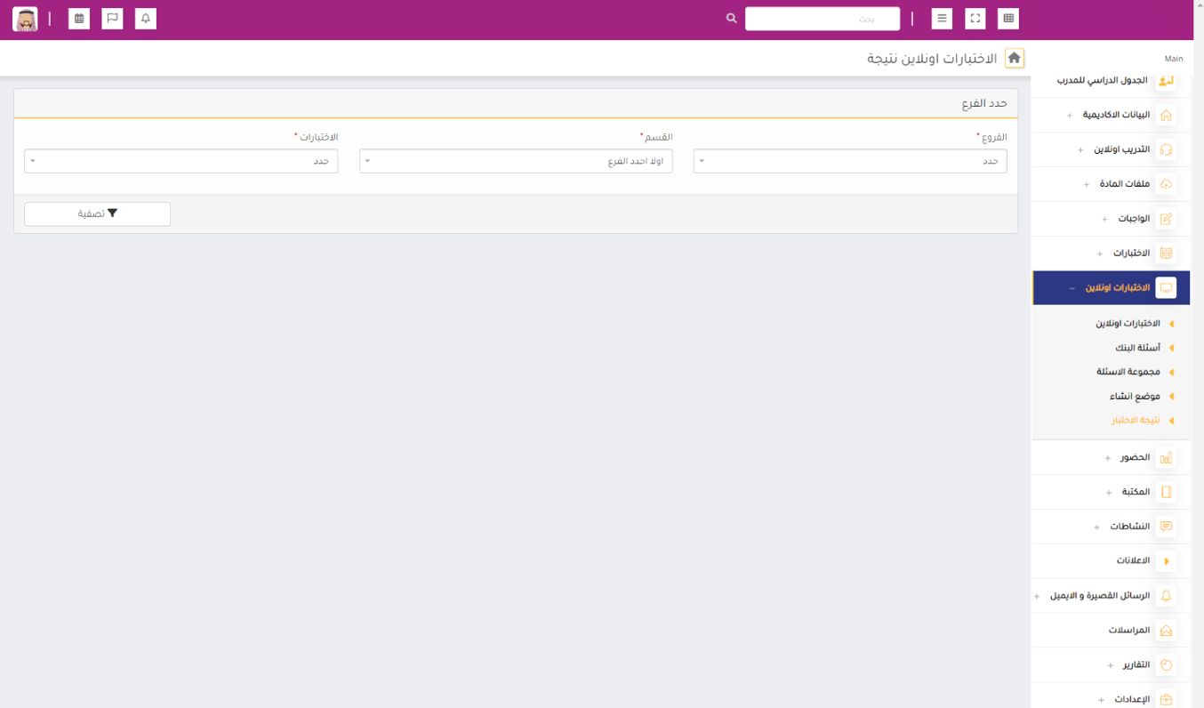 لعرض نتائج الاختبار قم بتحديد الفرع والقسم والاختبار ثم قم بفلترة البيانات المحددة